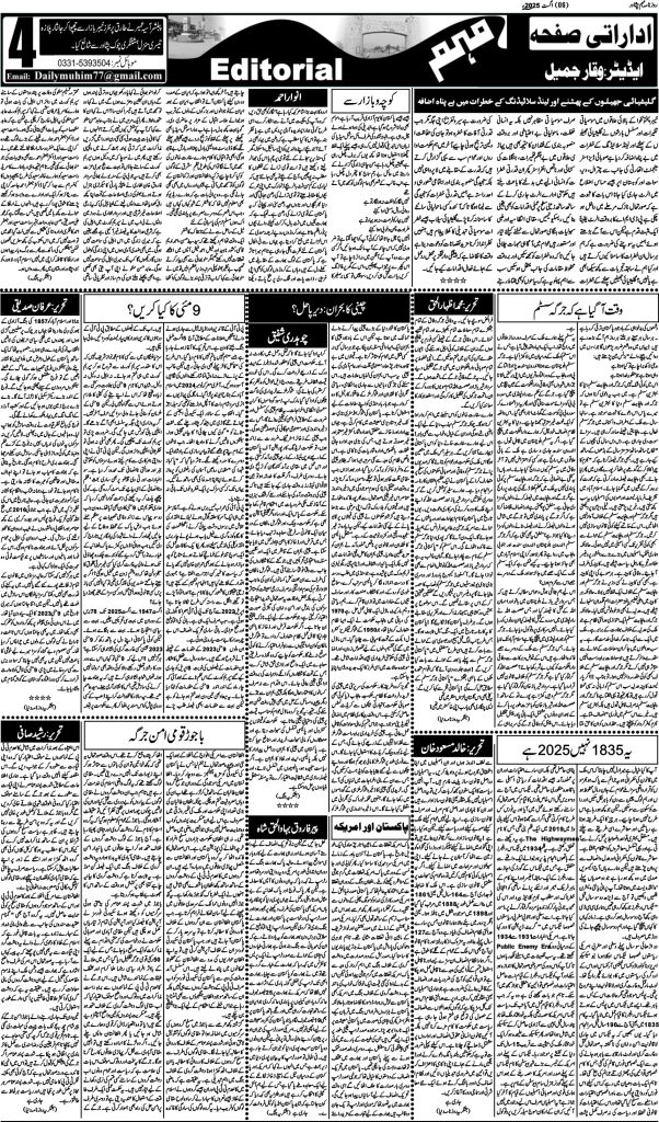 اخبار روزنامہ مہم 6 اگست 2025 dailymuhim اگست 6, 2025 About The Author dailymuhim See author's posts Continue Reading Previous: روزنامہ مہم 5 اگست 2025Next: روزنامہ مہم 7 اگست 2025 جواب دیں جواب منسوخ کریںآپ کا ای میل ایڈریس شائع نہیں کیا جائے گا۔ ضروری خانوں کو * سے نشان زد کیا گیا ہےتبصرہ * نام * ای میل * ویب سائٹ اس براؤزر میں میرا نام، ای میل، اور ویب سائٹ محفوظ رکھیں اگلی بار جب میں تبصرہ کرنے کےلیے۔ Related Stories روزنامہ مہم 22 اپریل 2026 اخبار روزنامہ مہم 22 اپریل 2026 اپریل 22, 2026 روزنامہ مہم 21 اپریل 2026 اخبار روزنامہ مہم 21 اپریل 2026 اپریل 21, 2026 روزنامہ مہم 20 اپریل 2026 اخبار روزنامہ مہم 20 اپریل 2026 اپریل 20, 2026