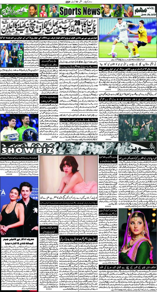 اخبار روزنامہ مہم 3 فروری 2026 dailymuhim فروری 3, 2026 About The Author dailymuhim See author's posts Continue Reading Previous: روزنامہ مہم 2 فروری 2026 جواب دیں جواب منسوخ کریںآپ کا ای میل ایڈریس شائع نہیں کیا جائے گا۔ ضروری خانوں کو * سے نشان زد کیا گیا ہےتبصرہ * نام * ای میل * ویب سائٹ اس براؤزر میں میرا نام، ای میل، اور ویب سائٹ محفوظ رکھیں اگلی بار جب میں تبصرہ کرنے کےلیے۔ Related Stories روزنامہ مہم 2 فروری 2026 اخبار روزنامہ مہم 2 فروری 2026 فروری 2, 2026 روزنامہ مہم 31 جنوری 2026 اخبار روزنامہ مہم 31 جنوری 2026 جنوری 31, 2026 روزنامہ مہم 30 جنوری 2025 اخبار روزنامہ مہم 30 جنوری 2025 جنوری 30, 2026