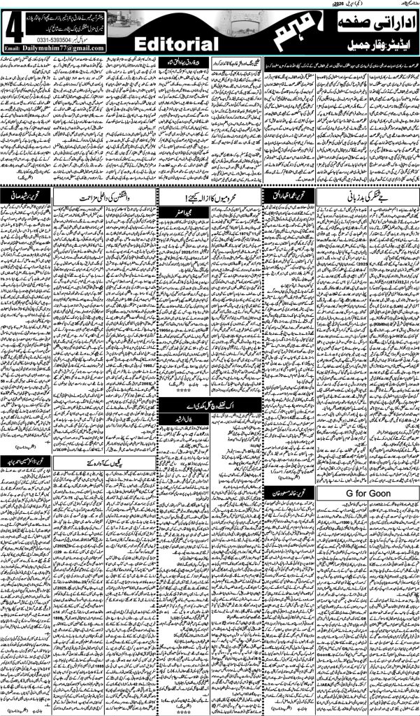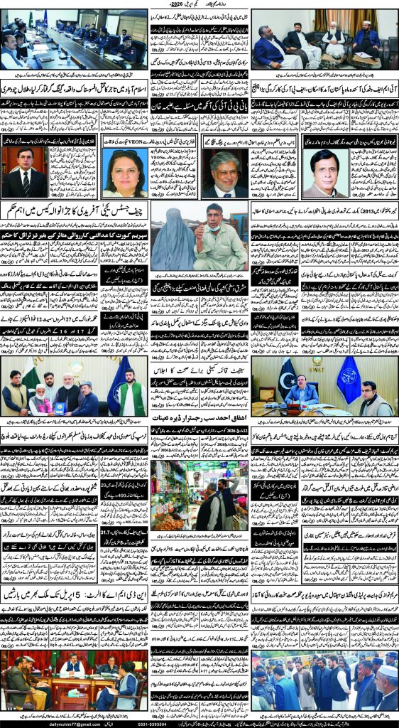 Uncategorized روزنامہ مہم 1 اپریل 2026 dailymuhim اپریل 1, 2026 About The Author dailymuhim See author's posts Continue Reading Previous: روزنامہ مہم 22 جنوری 2026 جواب دیں جواب منسوخ کریںآپ کا ای میل ایڈریس شائع نہیں کیا جائے گا۔ ضروری خانوں کو * سے نشان زد کیا گیا ہےتبصرہ * نام * ای میل * ویب سائٹ اس براؤزر میں میرا نام، ای میل، اور ویب سائٹ محفوظ رکھیں اگلی بار جب میں تبصرہ کرنے کےلیے۔ Related Stories روزنامہ مہم 22 جنوری 2026 Uncategorized روزنامہ مہم 22 جنوری 2026 جنوری 22, 2026 خیبرپختونخوا میں کرپشن، بدانتظامی اور پاک فوج کا عوامی خدمت میں کردار!تحریر: خوشحال خان Uncategorized خیبرپختونخوا میں کرپشن، بدانتظامی اور پاک فوج کا عوامی خدمت میں کردار!تحریر: خوشحال خان اگست 28, 2025 روزنامہ مہم 5 جولائی 2025 Uncategorized روزنامہ مہم 5 جولائی 2025 جولائی 5, 2025